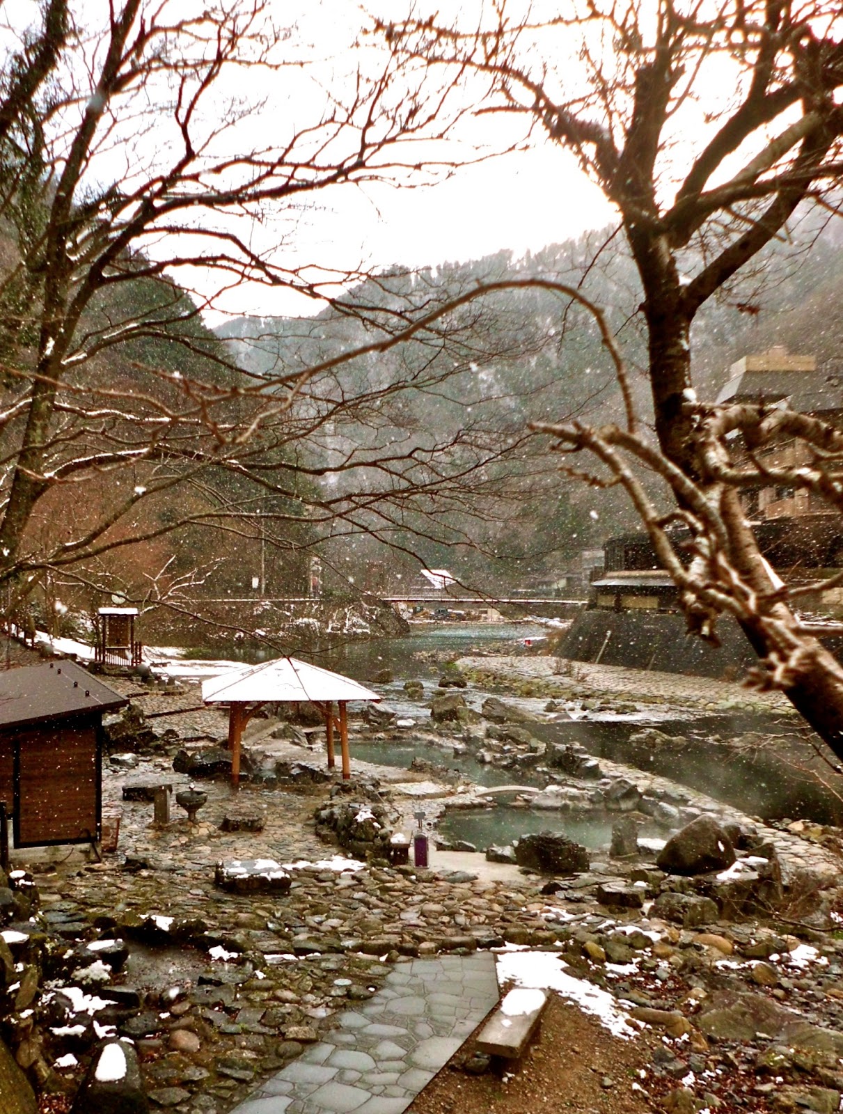 Being internally heated with sake we were feeling somewhat brave about going out to the river pools but still a little reluctant to go out in the cold. Yet, the memory and lure of the natural setting—we had been here before—finally overcame our reluctance. We put our down coats over the flimsy yukata and went out to the river. It didn't seem as cold as it had earlier even though we were wearing almost nothing (easier that way to get undressed quickly in the cold air to slip into the hot pool).